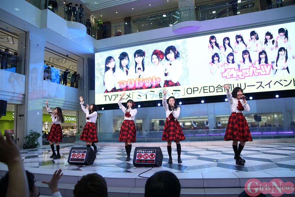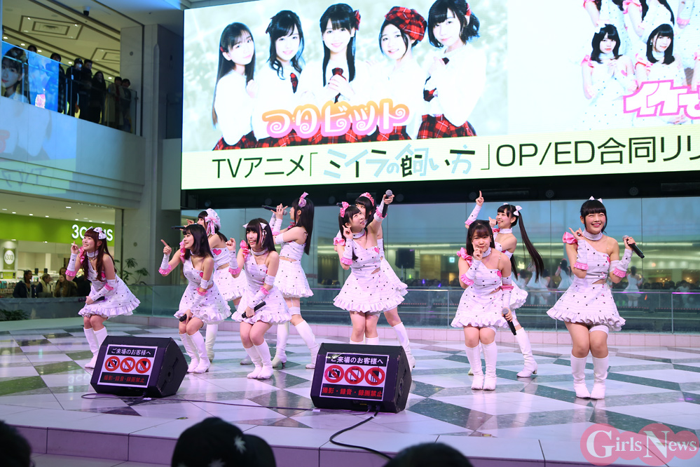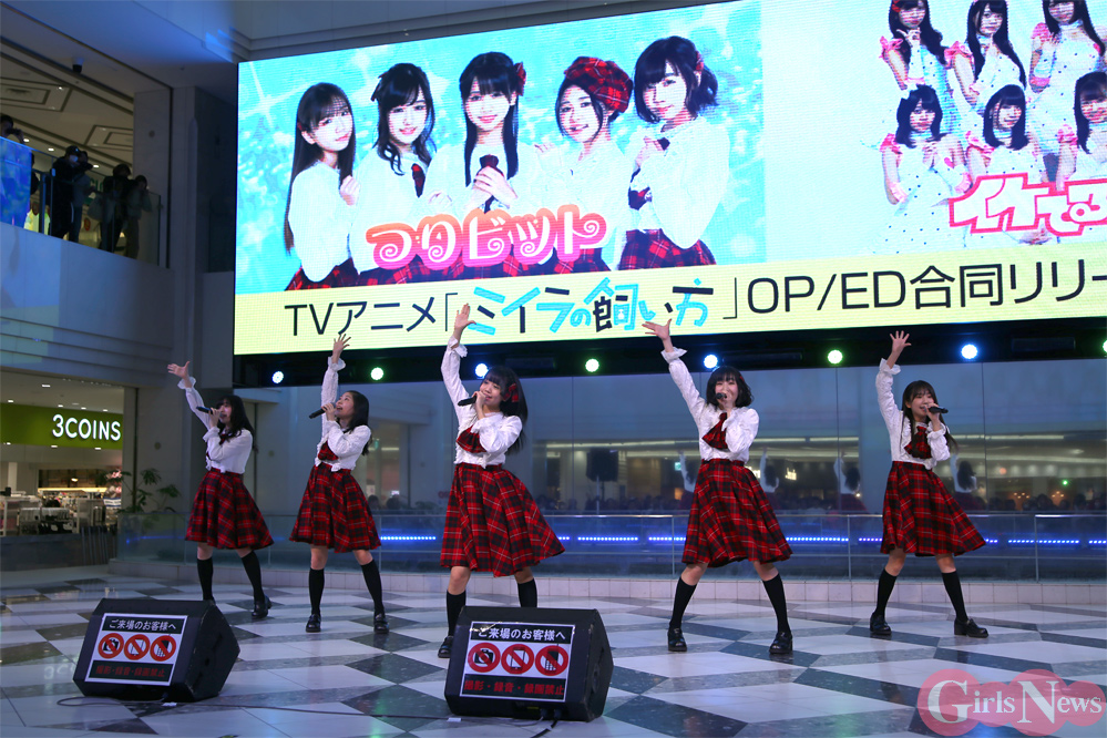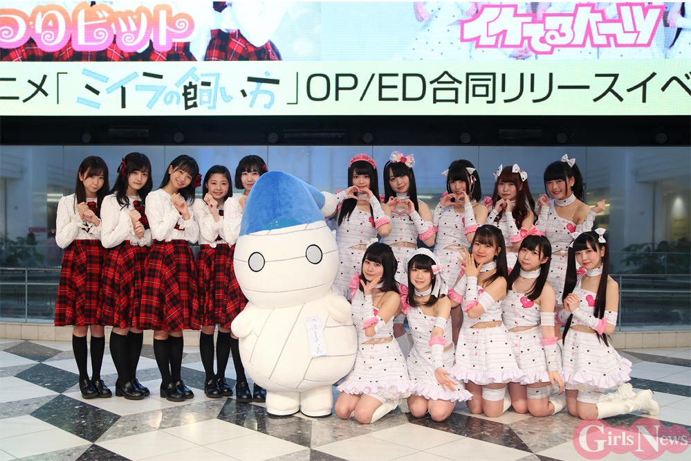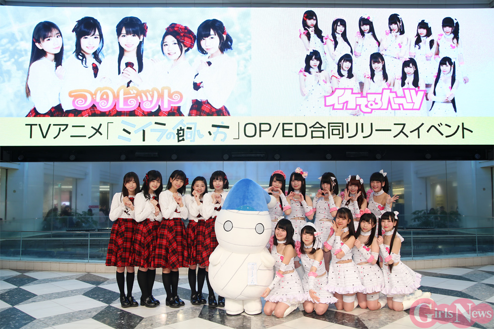 テレビアニメ『ミイラの飼い方』オープニングテーマを歌う「つりビット」と、同エンディングテーマを歌う「イケてるハーツ」が9日、池袋サンシャインシティ噴水広場で、合同のCDリリースイベントを開催した。