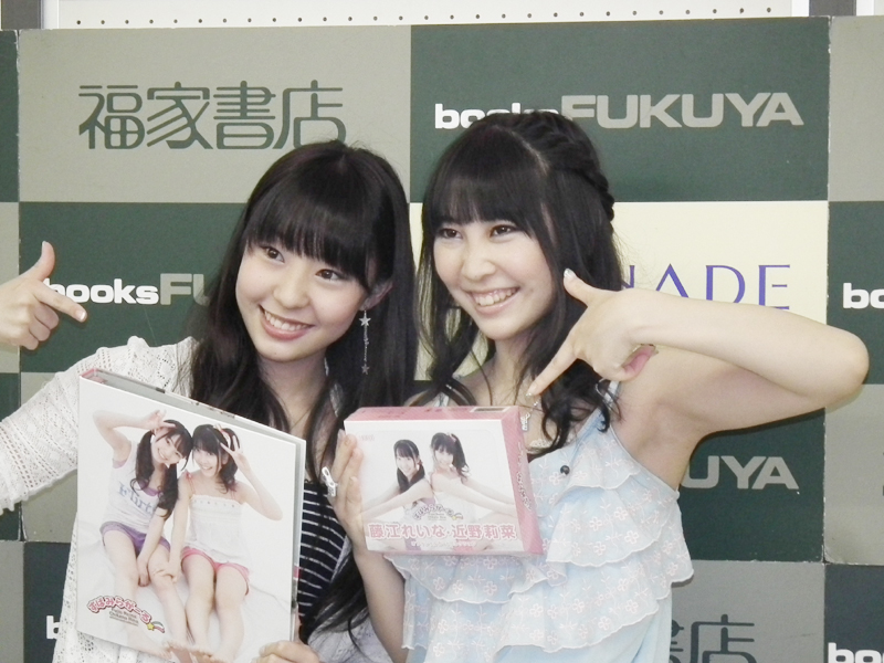 AKB48メンバーで現役高校生の藤江れいな(16)ちゃんと近野莉菜(17)ちゃんがトレーディングカード『すぱみらがーる☆』(さくら堂)を発売し、6月20日に東京・新宿の福家書店で握手会を開催した。