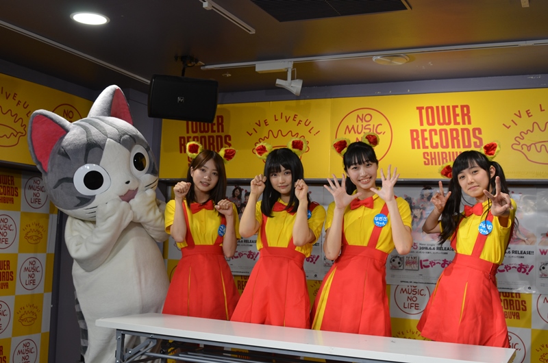 この日欠席のトミコ クレアさんを除く4人が、黄色×赤という“タワーレコード カラー”の衣装をまとい登場。ライブは新曲カップリングの『Let’s chu go』からスタートした。続くシングル表題曲の『にゃーお!』では、アニメのキャラクター“こねこのチー”も参加しコラボダンスも披露。そして3曲目は『サヨナラマタイツカ』。別れても繋がっている気持ちを表現した心にしみる一曲だ。