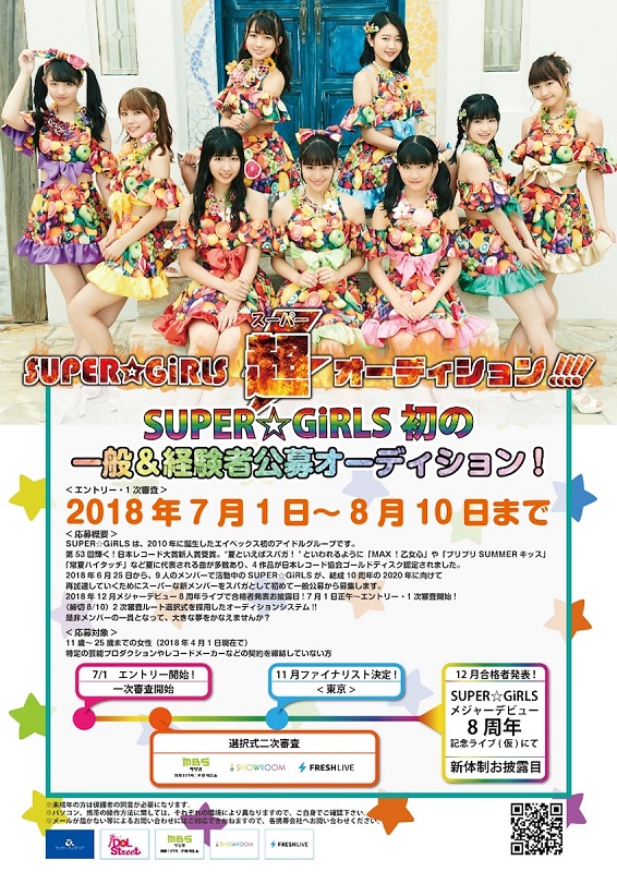 オーディションは11月4日にファイナリスト発表→12月下旬『SUPER☆GiRLSメジャーデビュー8周年記念ライブ』にて合格者発表・お披露目をする予定だ。