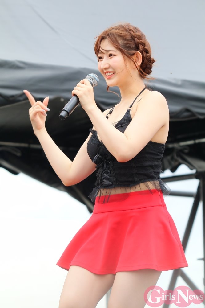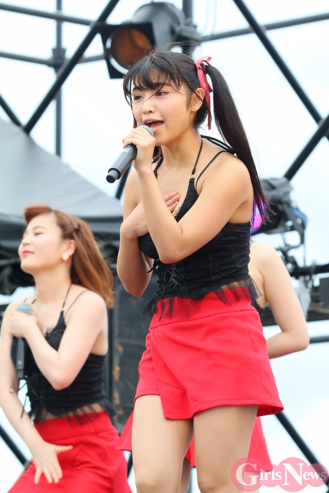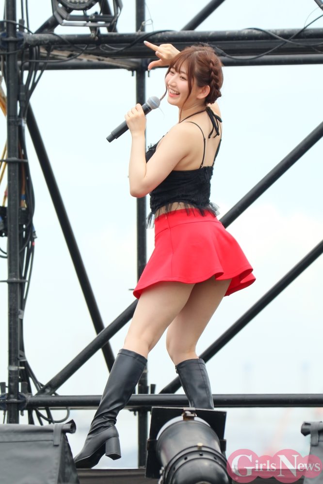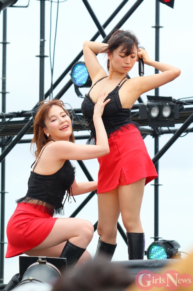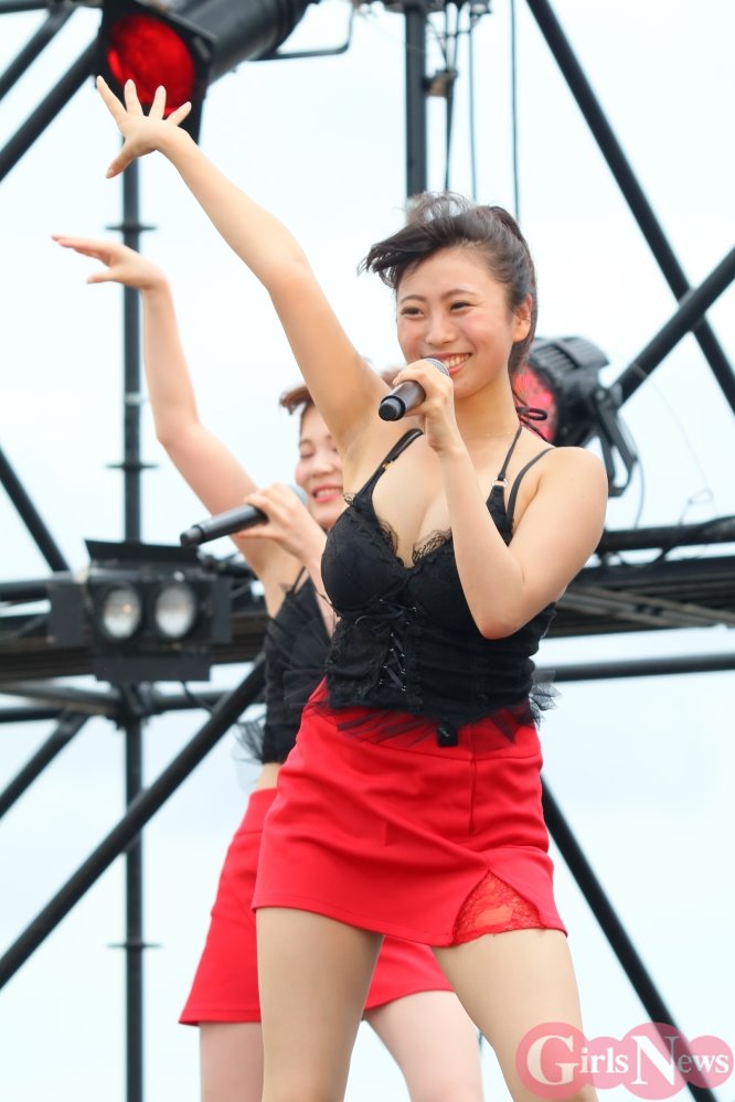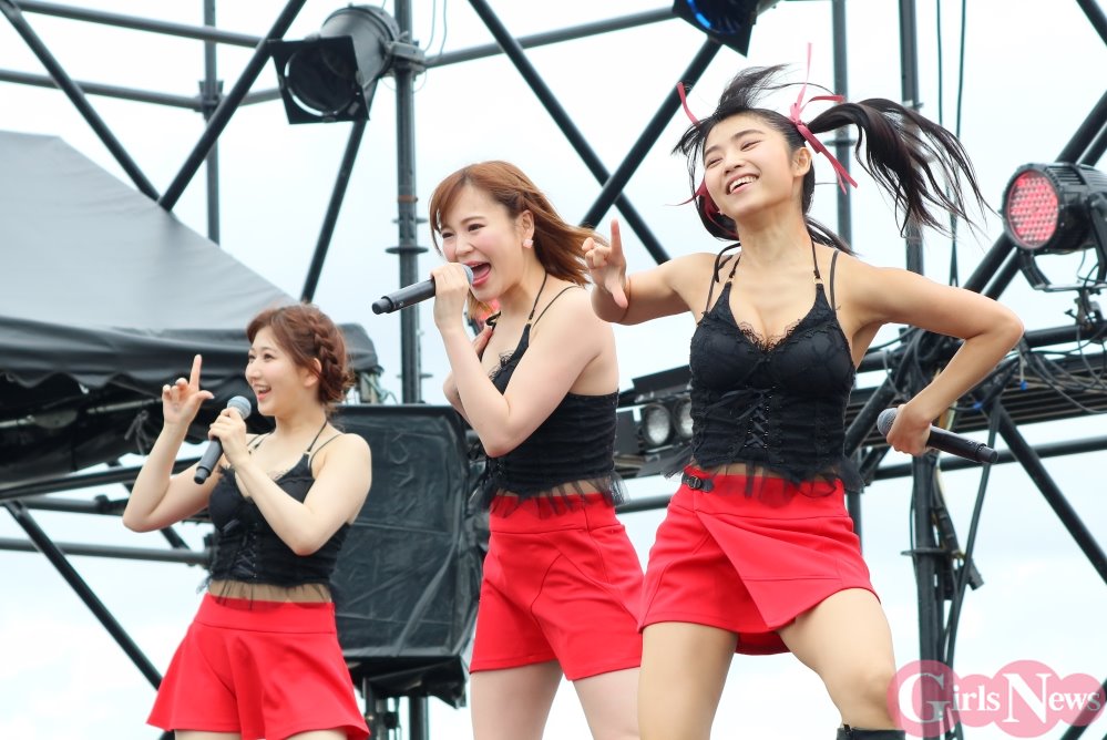 比較的最近の楽曲から、リフレインするメロディと宝石の名前を散りばめた歌詞が脳裏から離れなくなる『ダイヤモンドラブ』、夏の野外フェスにぴったりな熱いパッションの『熱っ波っ波 NE-PPA^PPA』、そして最後は思わず拳を振り上げたくなる『Raise a Flag』の3曲を、セクシーな振付を交えなから披露し、熱い会場をより熱く盛り上げた。