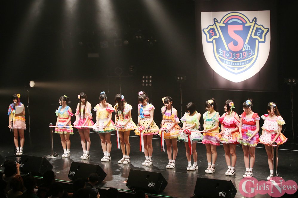 この日のイベントは冒頭に虹コンのメンバーが1列に並び、厳かにテープカットを行なった。「5周年イヤーの幕開けです!」の掛け声とともにテープにハサミが入ると会場から大きな拍手が沸き起こった。“ご臨席賜ります”などと堅苦しい言葉遣いに緊張していたメンバーも笑顔に戻り、新しいスタートをファンと共に喜んだ。
