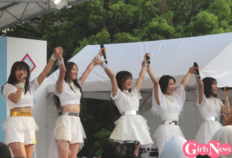 実はこの2組、同じ事務所に所属で、加入時期もほぼ同じという同期生。この日のステージでは、昨日女子流の4人で披露した純白の衣装に身をつつみ5人が登場。まずは5人がポンポンを手に東京女子流の『頑張って いつだって 信じてる』からスタートした。女子流にとっては、昨年久々のTIF出演で一曲目に歌った思い出の曲だ。
