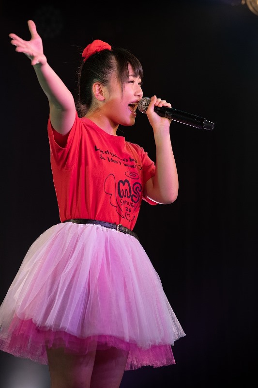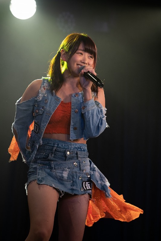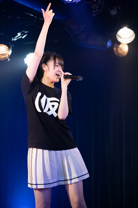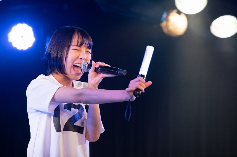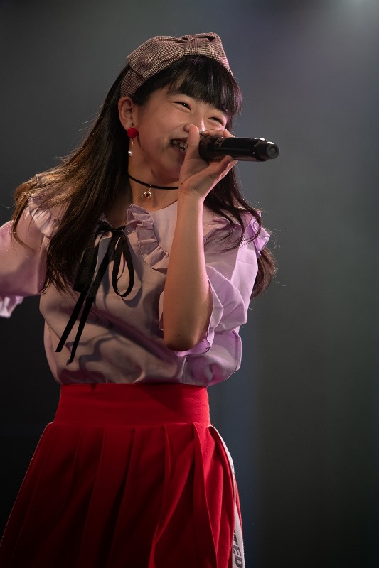 アプガ(2)の中沖凜は、「大好きなあの方の曲を歌います!」と、アプガ(仮)の元メンバー仙石みなみのソロ曲「サムライドル」を歌唱。真っ赤な仙石の生誕Tシャツを着た彼女は、しっかりとした歌声と愛らしいボーカルで観客を巻き込むようにパフォーマンス。「私は仙石さんが大好きなので、仙石さんファンの方投票お願いします。それ以外の人もお願いします!」と、会場全員にアピールした。