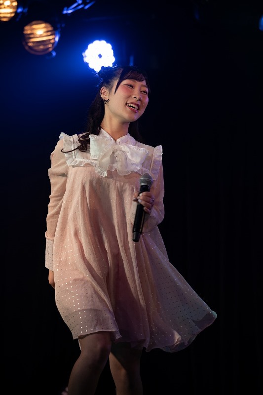 アプガ(プロレス)のラクは、アプガ(2)の衣装でアプガ(2)の「初恋 Ding Dong」を披露。キュートなポップチューンにマッチする、優しい雰囲気のボーカルでステージを行った。「普段のプロレスとはまた違う、私の理想のアイドル像をやってみました。今日はめっちゃスポットライトがいつも以上にまぶしく感じます」と、プロレスでの姿とのギャップをしっかりと見せてくれた。さらに、電車好きの彼女は、会場の最寄駅の秋葉原駅のマメ知識を披露した。