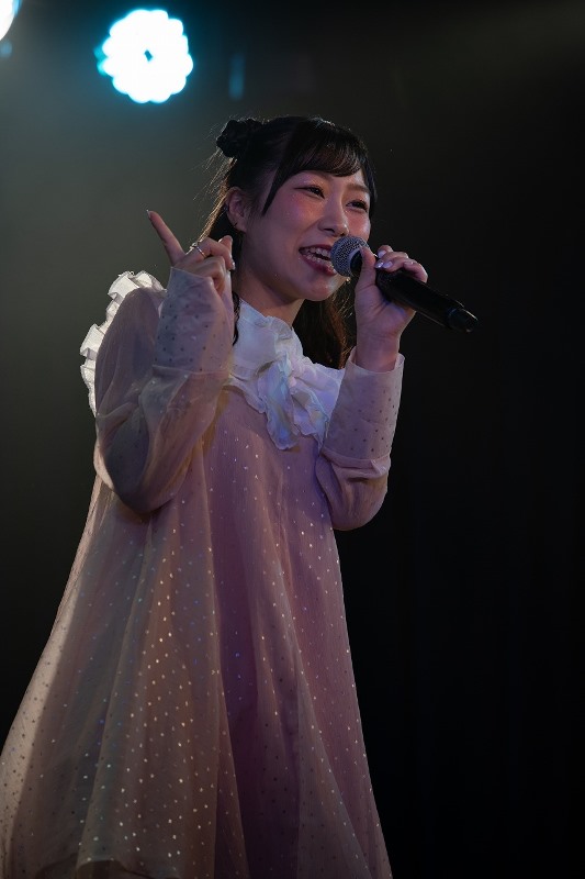 アプガ(2)の鍛治島彩は「サイリウム」を歌唱。普段のしゃべり声はハスキーボイスだが、とても愛らしいボーカルで楽曲を届けていく。楽曲の途中で、手にしていたサイリウムをリコーダーに持ち替え、元気さとかわいい雰囲気のステージを全うした。「(去年のアプガ(2)の)11月26日の初単独イベントでこの曲をソロで歌わせていただいたんですけど、そのときは満足いかなくて、どうしてもみなさんに感謝の気持ちをもっと伝えたくて、約半年かけてがんばりました」と、努力の成果をしっかりと見せた。