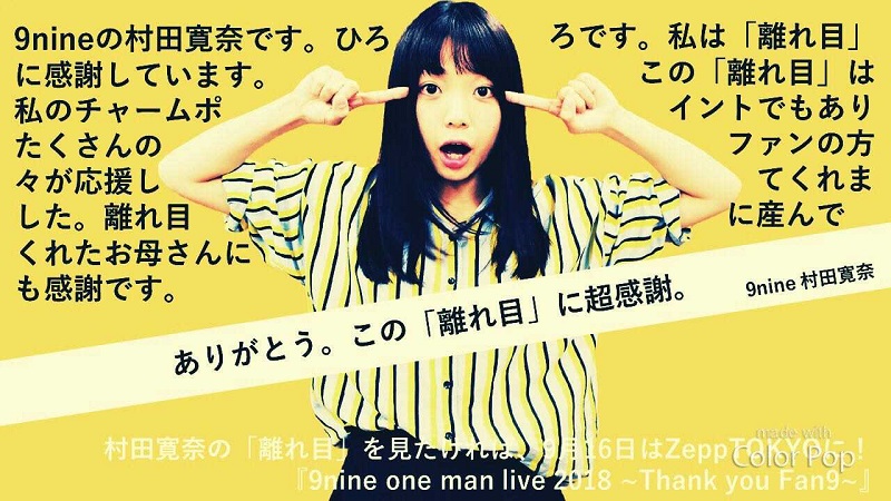 村田寛奈さんは、自身最大のチャームポイントである「離れ目」によって、多くのファンの方々が応援してくれたという理由で「離れ目」に感謝したポスター。