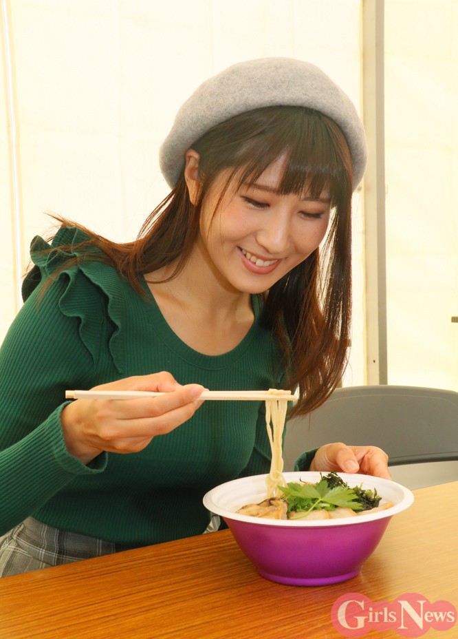 グラビアやライブで活躍中のアイドル・ソラ豆琴美さんは“三度の飯よりラーメンが好き”と、ラーメニスト(ラーメン愛好家)を自負する。ラーメンの試食リポートをお願いしたところ、「5杯はいけますよー!」と力むところを抑えて、2品を味わってもらった。