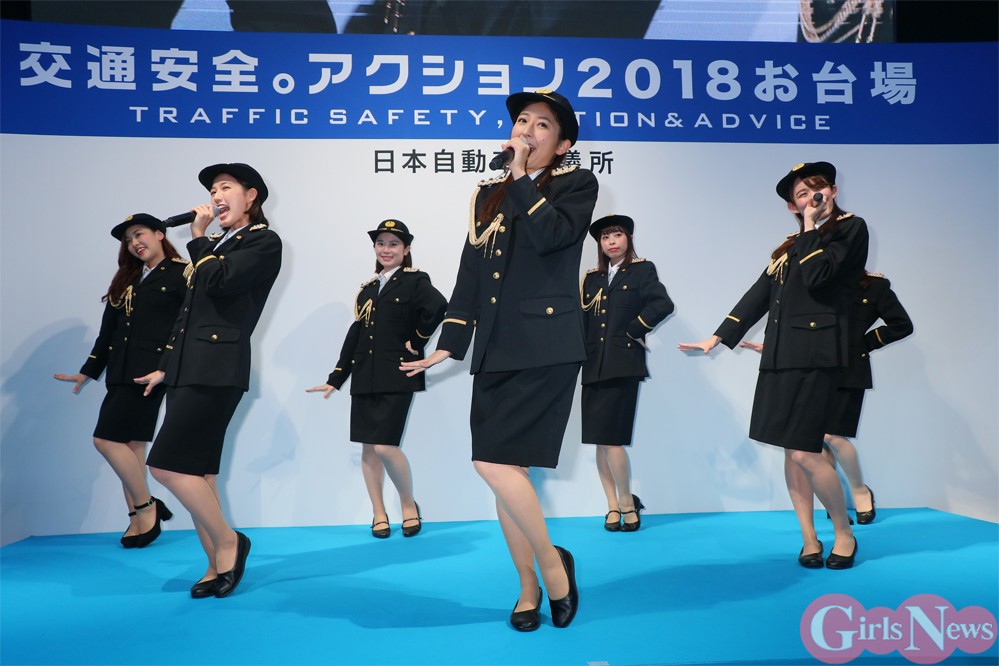 岡田彩花(2014年度ミス成蹊大)をはじめ、松井りな(2016年度中央大学ミスコンファイナリスト)、高尾美有(2014年度準ミス帝京大)、今回から新しく参加した三上珠英瑠(東洋大学)、市川怜美(学習院大学)、寺崎里恋(白百合女子大学)、須見円香(明治大学)の7名が歌とダンスを交えて交通安全を訴えた。
