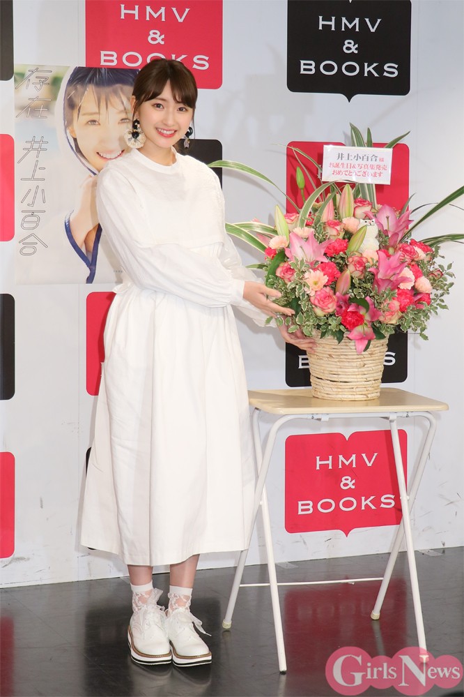 自身の名前の由来である百合の花をイメージした白い衣装で会見に登場した井上さんは、初めての写真集について、「今まで応援してくれていたファンの方や、支えてくださった方への恩返しを形にしたくて、たくさんの気持ちを込めた1冊なったと思います」と言い、タイトルの『存在』の意味を「井上小百合という存在が何者なのか、自分でもよく分からなかったのですが、“みんなのおかげで存在できている私”っていう意味で、感謝の気持ちを込めて付けました」と明かした。