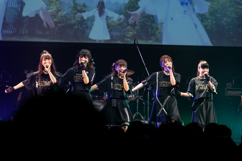 黒を基調としたロックな新衣装を纏ったメンバー、森みはる、江嶋綾恵梨、吉井美優、大門果琳、来栖りんの順に5人が登場。大歓声につつまれる中、ミュージカルのような世界が展開される人気曲『仮面に隠れたセレナーデ』からライブはスタートした。続けてファンのコールの中、疾走感あふれる『COLORS』『ニジマスエモーション』といったナンバーで、初めての生バンドでのパフォーマンスを魅せる。