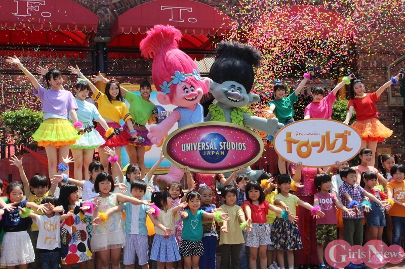 このイベントはドリームワークス・アニメーションとユニバーサル・ピクチャーズによるアニメ「トロールズ」の大ヒットを記念して行われたもの。つばきファクトリーのメンバーたちは「トロールズ」の人気キャラクター・ポピーとブランチに続いてステージに登場した。