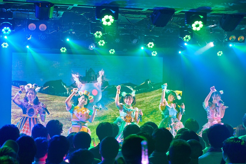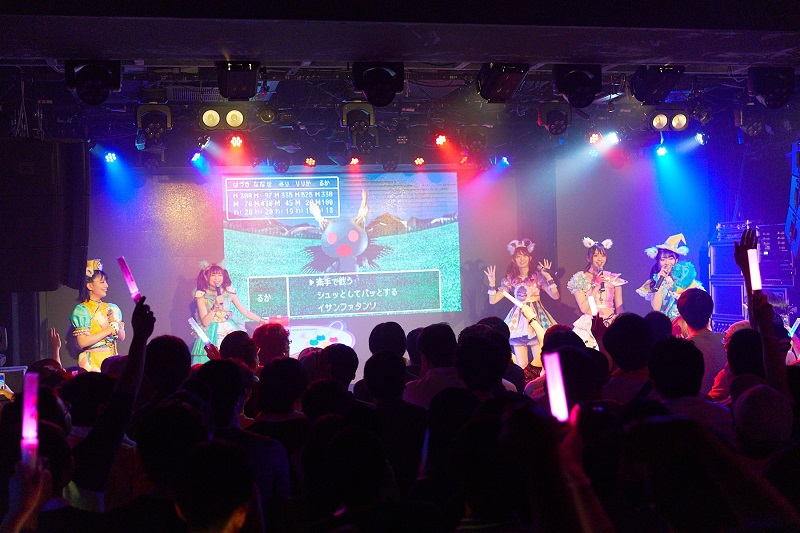 恵比寿CreAtoは会場の構造上、ステージ背面に敷き詰められたLED画面が特徴的だが、メンバーが登場するや否や、すべての映像がRPGゲームテイストに施され、ステージ上にいるわーすたメンバーはRPGゲームの主役さながらにライブを進行していく。