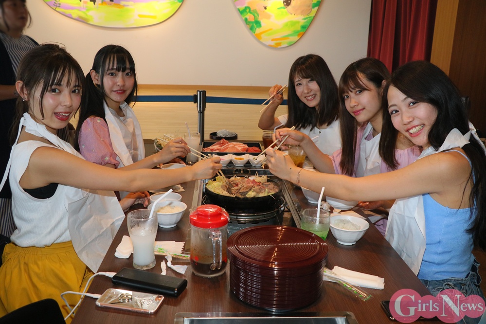 お待ちかねの昼食はジンギスカンの食べ放題。先ほどまで動物たちと戯れていたばかりというのに、気兼ねすることなくメンバーたちは牛や羊の肉を頬張った。それぞれのメンバーごとに分かれたファンのテーブルを回って談笑したり、お口に「あ~ん」をしてあげたりと、和やかな時間を過ごした。