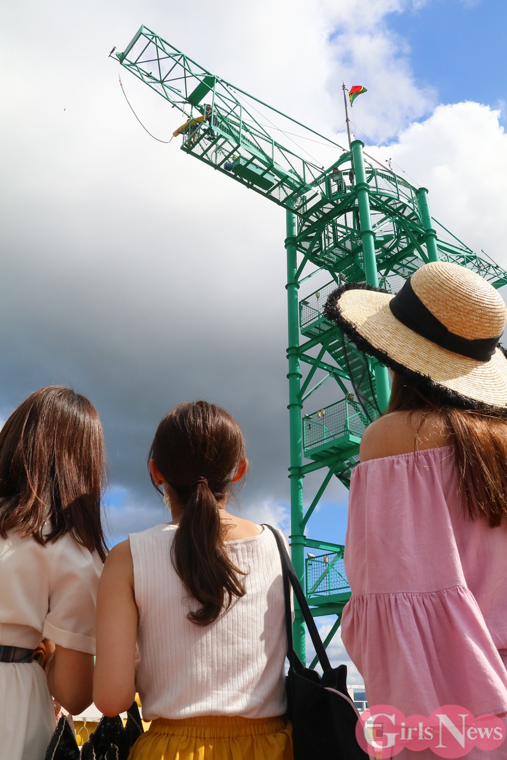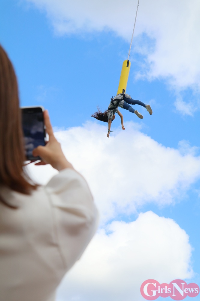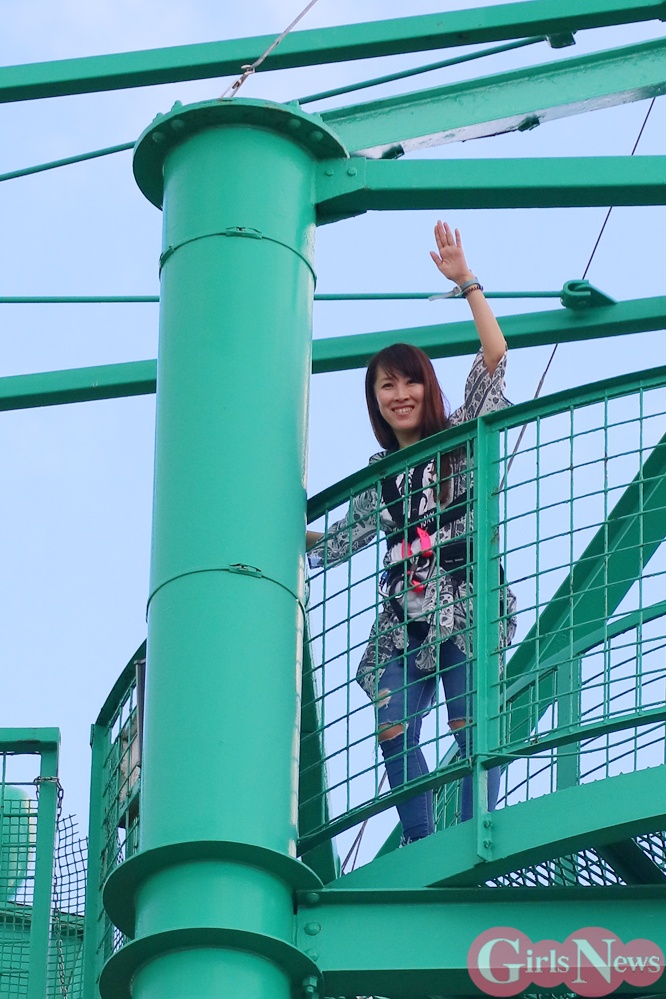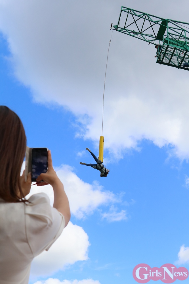 そして、本日のメインイベント(?)バンジージャンプの時間がやってきた。台の高さは21m!標高321mから見下ろす景色はそれ以上に恐怖を煽るという。「誰が飛ぶ?」と遠慮して譲りあうメンバーたちに代わってファンの勇者が挑戦しようとするも、制限事項によりチャレンジを断念。そこで「私が!」と名乗りを上げたのは、ツアーを盛り上げるために添乗してくれた お笑いコンビ「こじらせハスキー」の橋爪ヨウコさんだった。相方のドイツみちこさんや、ツアーの参加者が見守る中、ヨウコさんは見事にダイブを決めた。みんなの拍手に迎えられて「思った以上に高かった。生きていて良かったです」と大きく息をついた。