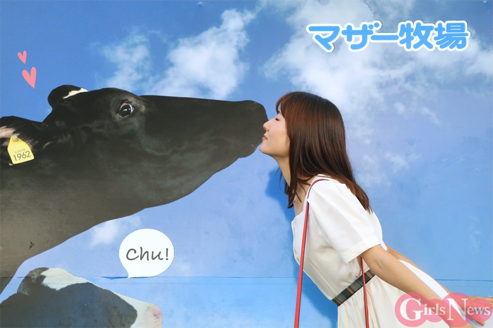 マザー牧場に到着すると、さっそく全員でファームツアーに参加。トレーラーで牛舎などを見学したほか、農場内で動物たちと触れ合う時間もあり、最初は怖がっていたメンバーたちも羊たちをなでて、ナマの “羊毛” の肌触りを確かめた。