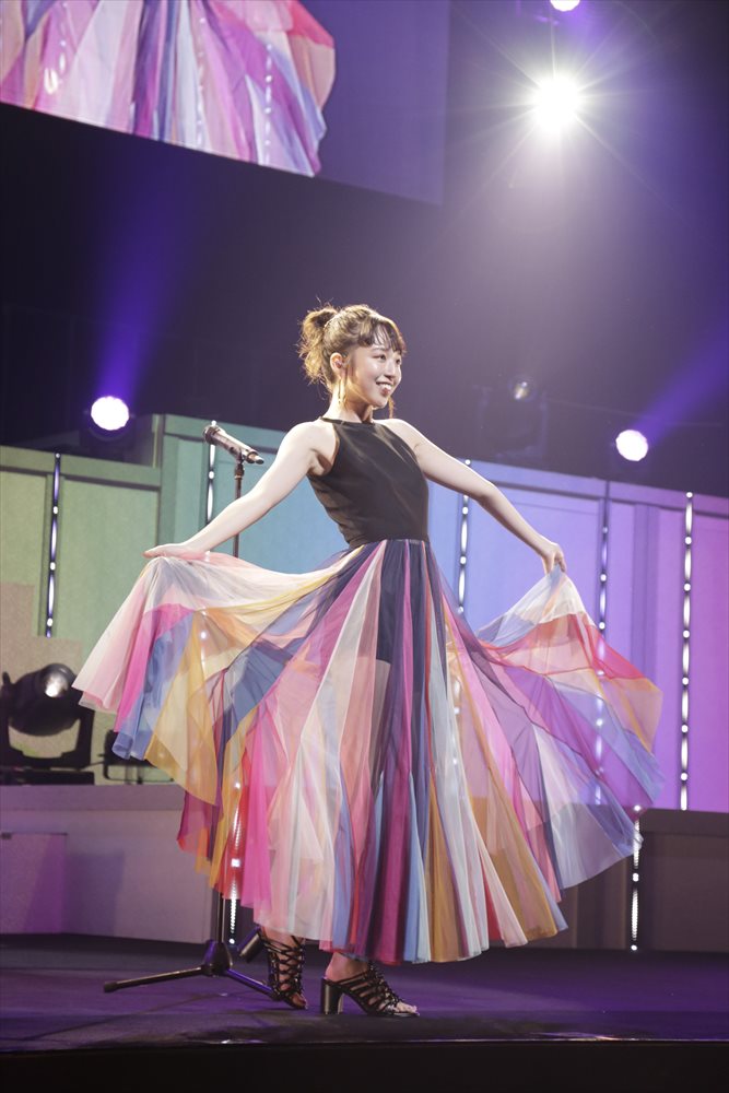 今回のライブの衣装は勝田さんの意見が大きく取り入れられているそうで、最初の黒一色の衣装は、これまでのアンジュルムであまりなかったスタイリッシュな衣装となっている。ソロの衣装も定番のドレスではなく、勝田さんが「希望の虹と大人っぽさ」をイメージしてデザインしたシースルーのスカートをまとった。