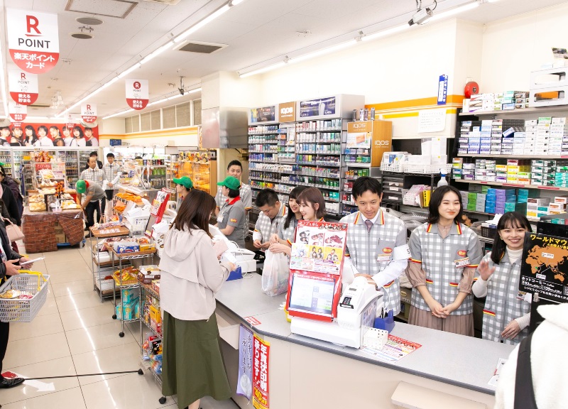 デイリーの制服を着た川村さん、佐々木さん、上國料さん、太田さんの4人は、現地に到着するとレジ カウンター内でレクチャーを受け、14時から一日店長業務をスタート。川村・太田ペアと佐々木・上國料ペアで抽選 40名ほど接客・販売をおこなった。
