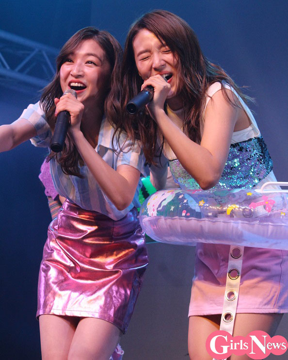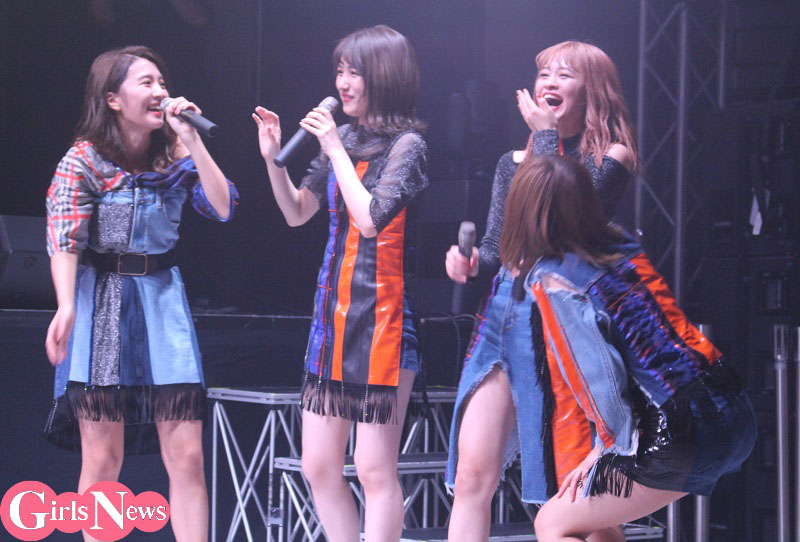 この日3着目の衣装は、2017年発売のミニアルバム『Summer Glitter』のジャケットのもの。この衣装といえば……ということで、「あの曲やっちゃいますか!?」と盛り上がる中、リーダーの高嶋さんが『Glitter』の曲紹介のところ、『Summer Glitter』!と、アルバムタイトルのほうを叫んでしまう痛恨のミス。「ちょっとぉ」とツッコミまくる他メンバーたちだった。