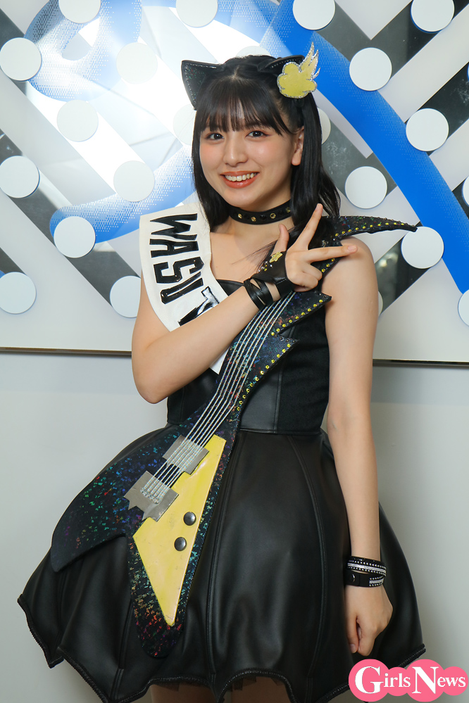 坂元葉月「衣装のデザインを見たときに「ギター?」って驚いて。すごく大きく描かれていたんですけど「このままそっくりの感じにしてください」って指定だったので、どこまで再現できるのか楽しみでした。本当にイラスト通りの仕上がりですけど踊りやすくてお気に入りです。着ているとギターが弾けちゃう気分になりますね…弾けないんですけど(笑)」