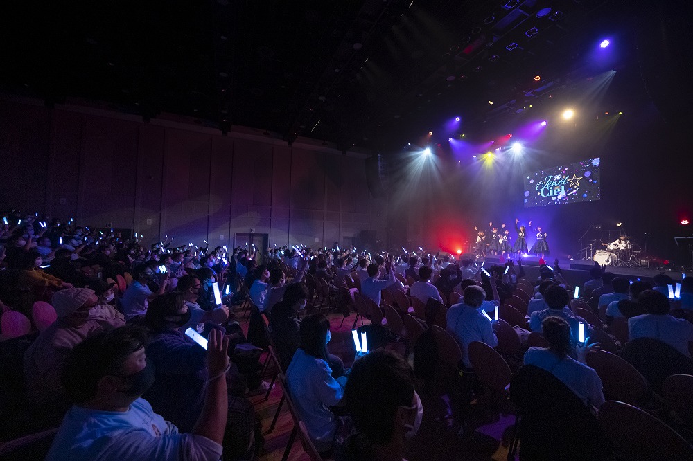 コロナウイスル感染防止対策の下で行われたこのライブはソーシャルディスタンスを保ちながらお客様は全員着席、声を出さずに観覧となった。メンバーの一色素良さんが「夢にまでみた」という生バンドでのライブ。観客が声を出せない分、客席のペンライトがいつも以上に華やかに振られた。