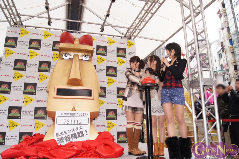 そして、突如渋谷109前に謎の物体が渋谷109前に降臨。赤い幕がかけられており、ドラコレガールズがボタンを押すと全長3メートルの「モンスダス」の巨大モニュメントが出現。