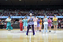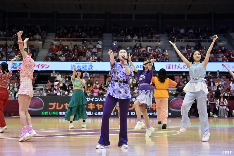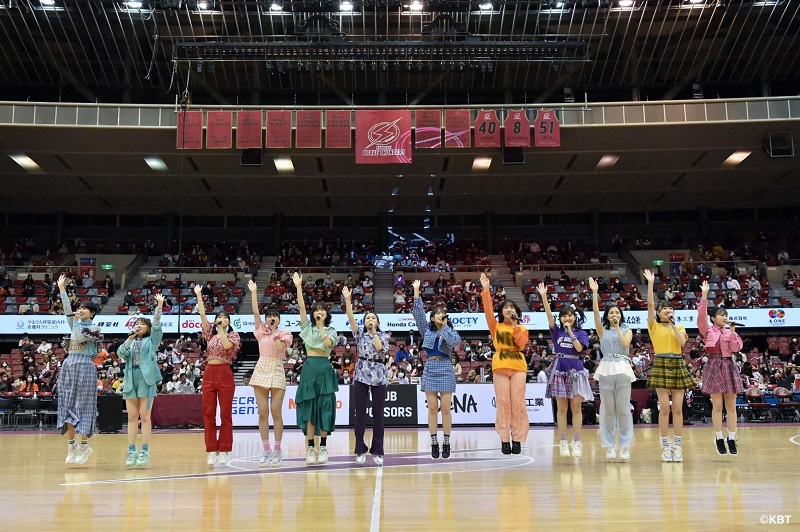 この日のとどろきアリーナは第5節、第6節とチーム3連勝中の地元の開催ということもあり、チケットは完売。第1Qと第2Qは混戦となり、1点差で前半を終え、ハーフタイムに突入。会場のアナウンス紹介より360°から見渡せるコート中央にBEYOOOOONDSメンバーが登場。バスケ観覧が大好きな、高瀬くるみが「今日は短い時間ですが、アツい試合を受けてハーフタイムも盛り上げたいと思います!」と挨拶し、メジャーデビューシングル『ニッポンノD・N・A!』と、『ビタミンME』の2曲をパフォーマンスした。メンバー12名で力強く全2曲を歌唱し、後半戦へ向けて会場を盛り上げた。