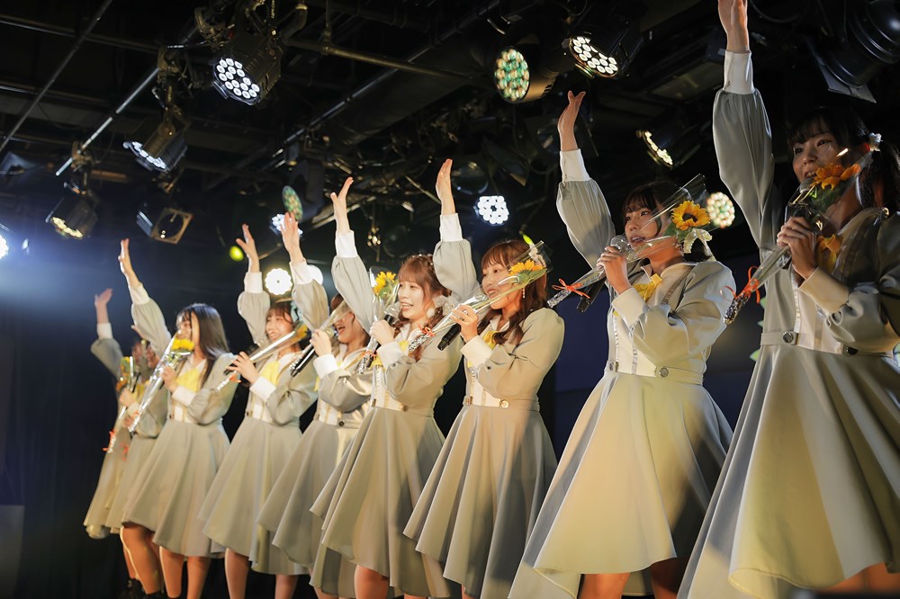 デビューシングルの『向日葵の帰り道』を皮切りにスタートした公演は、グループカラーである黄色のライトでファンが会場を明るく照らし、まるで向日葵畑のようなあたたかい雰囲気に包まれた。中には序盤から目を潤ませるメンバーもいる中、全身全霊で楽曲をパフォーマンスし客席を盛り上げた。
