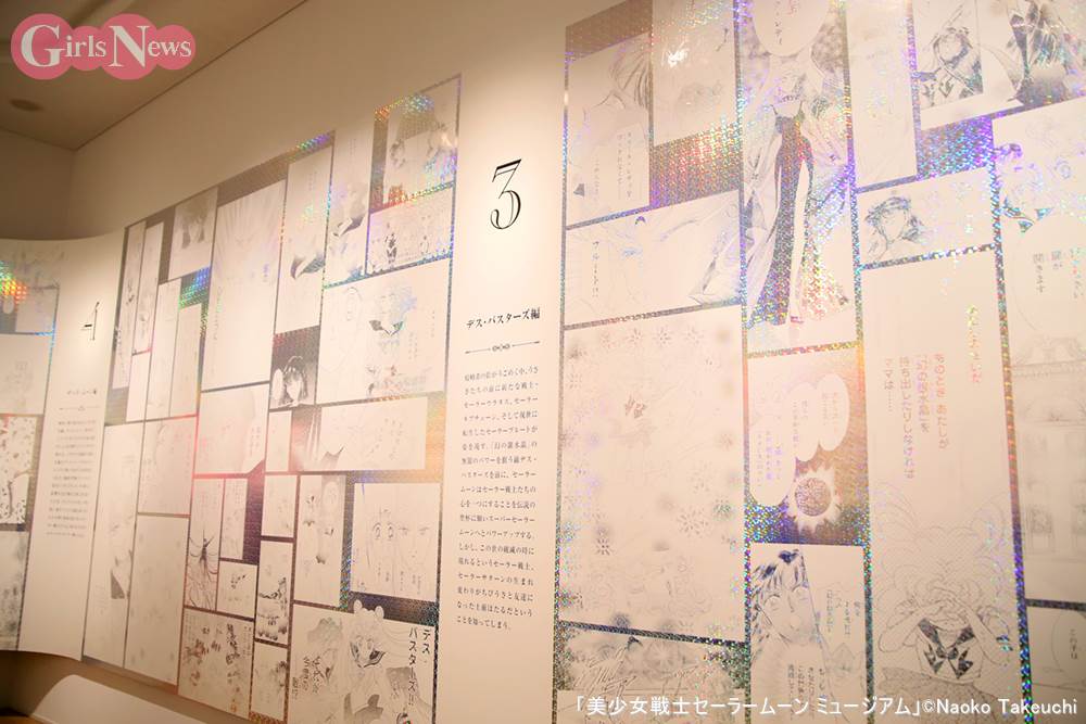 部屋一面に原作漫画の名シーンが散りばめられていてます。ミラーボールの光がホログラムの壁に反射して、部屋中がキラキラしているんですが、セーラームーンのキラキラした世界感を表していると思いました。名ゼリフや名シーンを中心にあらすじが分かるようになっていて、原作を読んでる人は自分の好きなシーンがこんなに大きく描かれていることに感動すると思います。