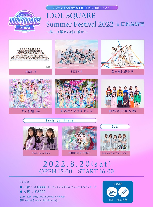 同イベントには、第一弾の出演アーティストとして、Main StageでAKB48、私立恵比寿中学、でんぱ組.inc、虹のコンキスタドール、BEYOOOOONDS、Push up StageでTask have Fun、FRUITS ZIPPER、Opening ActにはBABY -CRAYON〜1361〜の出演が発表されている。
