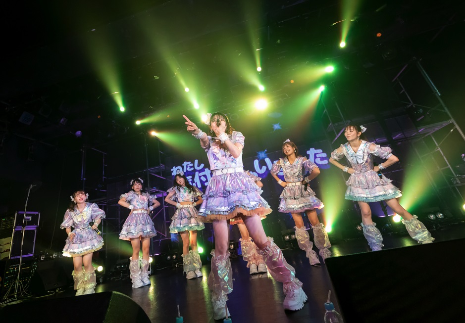 オープニングを飾るのは王道アイドルソング「skyfeelan」。メンバーのツイートをもとに作詞されたこの楽曲。7人は自分の実感のこもった言葉を歌いあげる。初ワンマンライブにも関わらず、硬さはまったく感じられず、しなやかに楽しむ姿が頼もしい。続く「君の明るい未来を追いかけて」も爽やかなナンバー。ファンも一緒にサビの振りを踊り、7色のペンライトがフロアのそこかしこで煌めく。