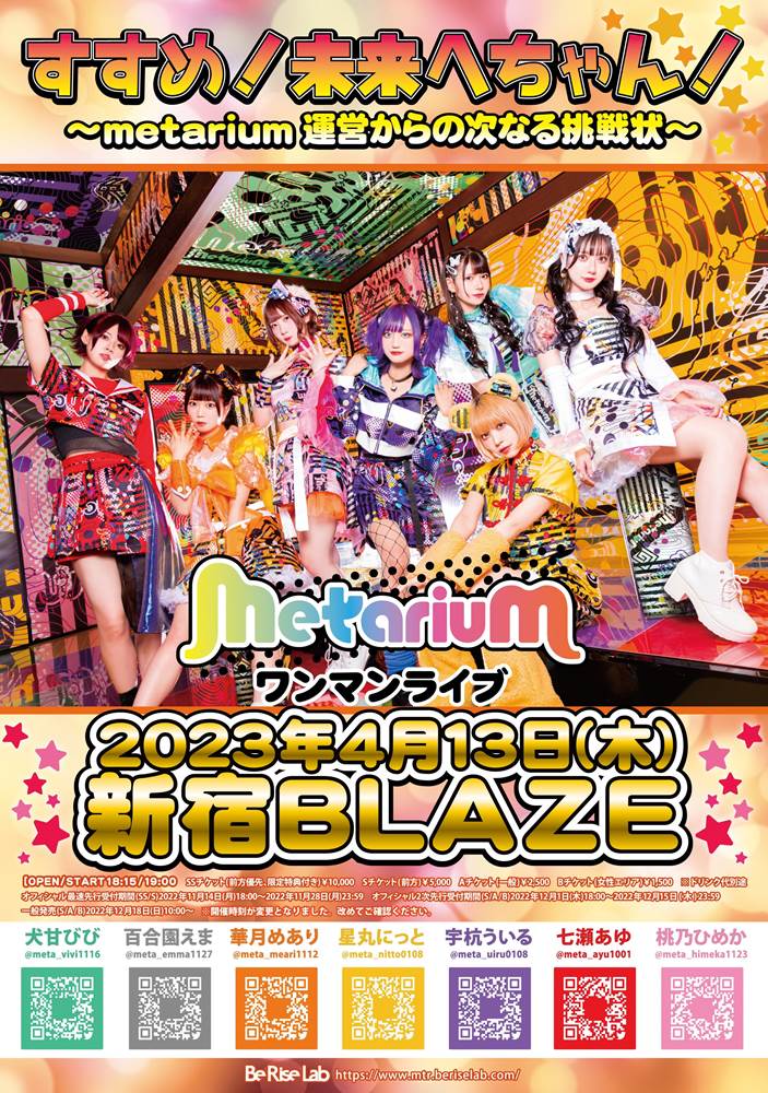 デビュー公演で、最高のスタートを切ったmetarium。彼女たちは、2023年4月13日に新宿BLAZEでワンマン公演を行うことを発表した。デビューから5ヶ月後に、すでに大舞台でのワンマン公演が決まっている。その日までに、どんな未来が更新されていくのか楽しみにしていようか。