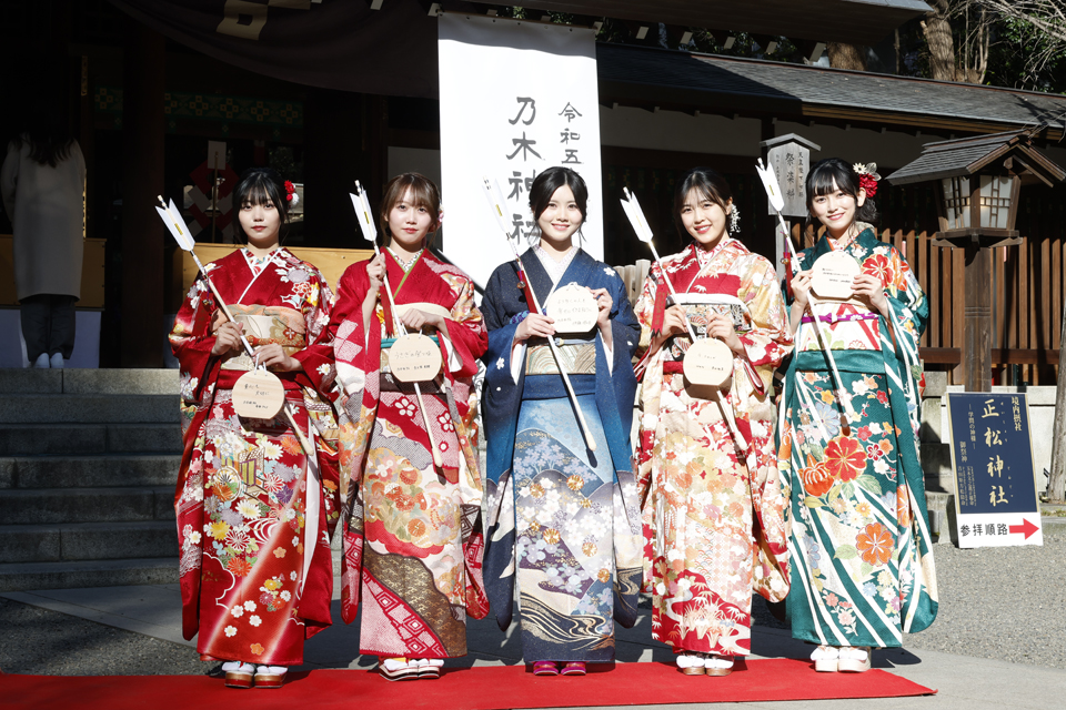 乃木坂46で、2022年4月から2023年3月にかけて20歳となる、伊藤理々杏、柴田柚菜、矢久保美緒、池田瑛紗、中西アルノの5名が6日、グループのゆかりの地・乃木神社にて、晴れ着姿をお披露目した(掛橋沙耶香はケガの治療のため欠席)。