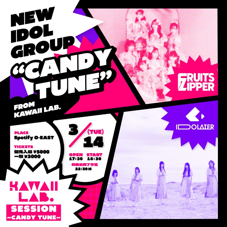 また、CANDY TUNEのデビューライブとなる「KAWAII LAB. SESSION ~CANDY TUNE~」が3月14日(火)Spotify O-EASTにて開催決定。ライブにはKAWAII LAB.に所属するIDOLATER、FRUITS ZIPPERの出演も決定しており、CANDY TUNEは先輩グループと同じステージで初パフォーマンスを披露する。優先入場チケットは2月2日(木)21:00より抽選受付開始。