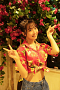 特にお気に入り衣装は「オレンジのリゾート柄水着です! オレンジとか明るい色は普段あまり身につけないぶん、新鮮さがありました! 髪型もアップにして元気いっぱいに撮影したのですが、その元気な感じがお気に入りです!」と語る。