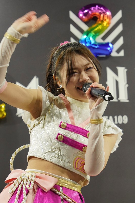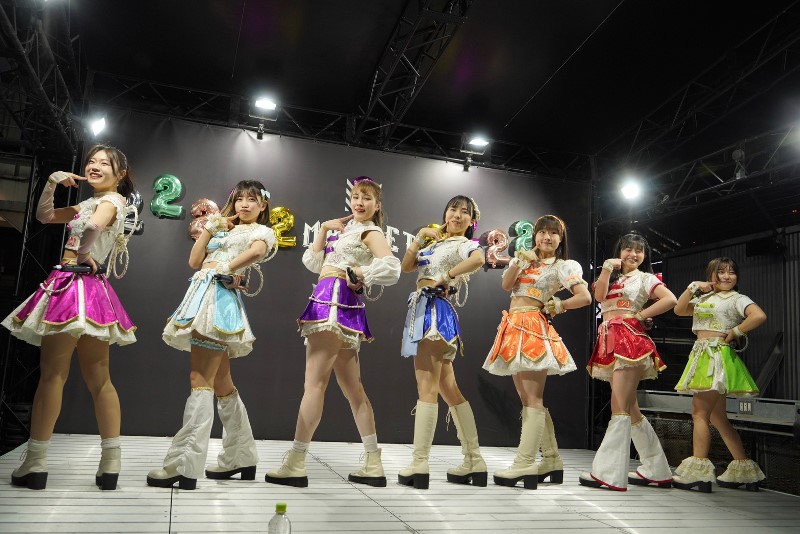 2月22日はニキの日ということで、屋外の会場に“2”のバルーンを手にした大勢の観客が来場。ミニライブは、2nd EPに収録された『Dong-Dong-Dong!!!!!!!!』から勢いよくスタートする。リーダーの高萩千夏、サブリーダーの鍛治島彩、中川千尋、佐々木ほのか、森永新菜、島崎友莉亜、新倉愛海のメンバー7人は、寒さを吹き飛ばすように元気に歌とダンスを届けていった。