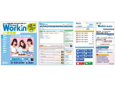 地域密着総合求人情報メディアWorkin(ワーキン)はフリーペーパー「WorkinFree」のほか、PC・スマートフォンサイト「WorkinWeb(ワーキンウェブ)」、携帯サイト「WorkinMobile(ワーキンモバイル)」の4つのプラットフォームで展開。