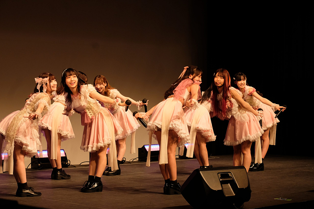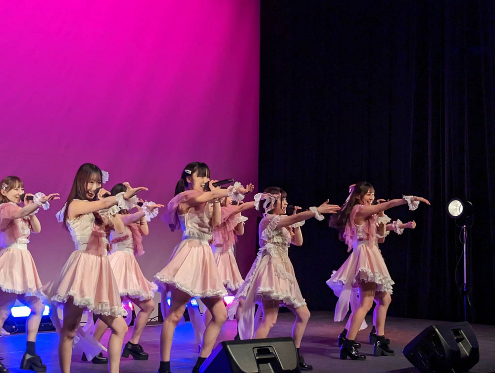 グループ名でもある桃色の衣装を身にまとい1曲目は明るくPOPな曲で盛り上げMCではお客さんとのコール&レスポンスで会場全体を温めた。