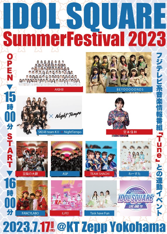 フジテレビ系音楽情報番組「Tune」と連動したライブイベント『IDOL SQUARE Summer Festival 2023』が、7月17日(月・祝)にKT Zepp Yokohamaで開催。AKB48、BEYOOOOONDS、SKE48 team KⅡ×Night Tempo、宮本佳林、豆柴の大群、ASP、TEAM SHACHI、わーすた、FANCYLABO、iLiFE!、Task have Funが出演する。公演ではSKE48 team KIIの劇場公演、楽曲プロデュースをしたNight Tempoとの一夜限りのコラボステージも実現する。