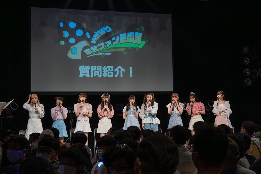 開演時刻となり、いぎなり東北産「負けないうた」に乗って、“夏のデート服”をコンセプトとした衣装に身を包んだ9人がステージに勢ぞろいする。なお本イベントは、彼女たち曰く、「普段のライブとは趣旨が異なる“お楽しみ会”的なイベント」とのこと。確かにステージ上の彼女たちも、ライブで見せる少し緊張したような面持ちではなく、リラックスした様子だった。