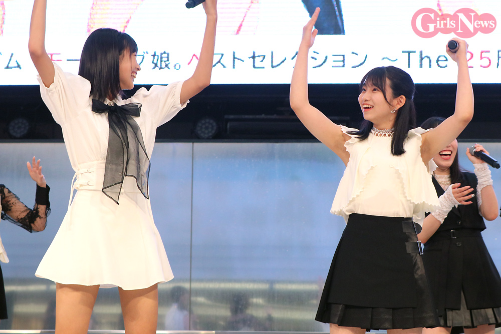モーニング娘。’23 が23日、25周年記念アルバムのリリースイベントを開催。新メンバーの井上春華さんと弓桁朱琴さんが、初めて池袋サンシャインシティ噴水広場に登場した。