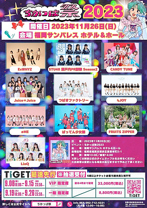 Juice=Juice、つばきファクトリー、≠MEら人気アイドルが出演するライブイベント「ちかっぱ祭2023」が11月26日(日)に福岡サンパレス ホテル & ホールにて開催。チケットはイベントプラットフォーム「TIGET」にて独占先行受付中だ。