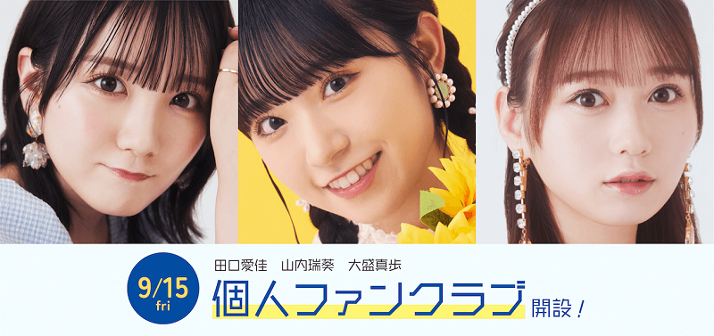 AKB48のメンバー・田口愛佳、山内瑞葵、大盛真歩のソロファンクラブ(運営=株式会社ANYLAND)が9月15日にオープンする。