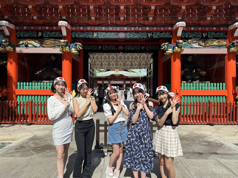 動画の冒頭、6期メンバー全員が頭に”気合“の文字が書かれたハチマキを着用し、すでに気合十分の様子で登場。6期メンバー最年長で、舞台などでも活躍する鎌田彩樺は、「私たちの始まりの場所でもあるここ(神田明神)で、新しい企画をスタートしたいと思います!」と元気に話すと、神田神社の境内へ。手水舎で丁寧に手を清め、6期メンバー全員が横一列に並び、本殿へお参りを実施。