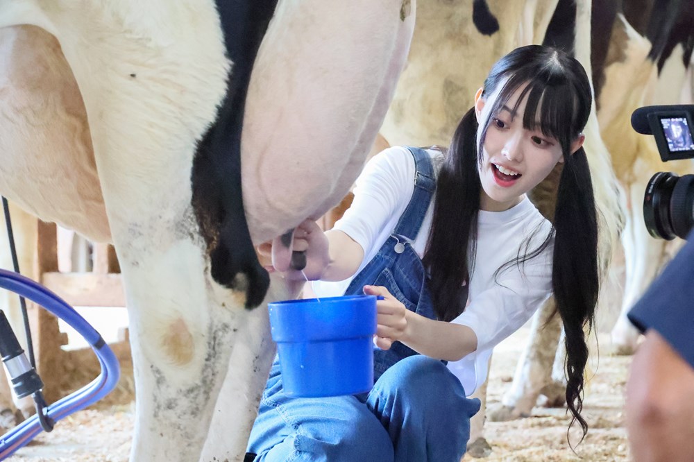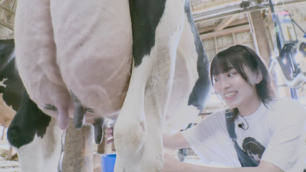 さらに、「酪農家体験動画」では、メンバー3人(春野莉々さん・松本ももなさん・籾山ひめりさん)が生乳生産現場を訪問を訪問し、早朝から始まる業務を手伝いながら、乳牛の世話や生乳生産の手順、そして酪農の現状について学んだ。