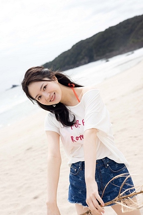 今回公開されたのは、神社の境内の前で撮影されたカット、ビーチで砂の中から発見した変わった形の流木を手に、いたずらっぽい笑顔を向ける様子。そして朝を感じさせる旅館の一室で、パステルカラーのタンクトップを身に着けこちらを見つめるカット。彼女の透き通るような素肌と吸い込まれそうな薄いブラウンの大きな瞳が透明感あふれる 1 枚となっている。
