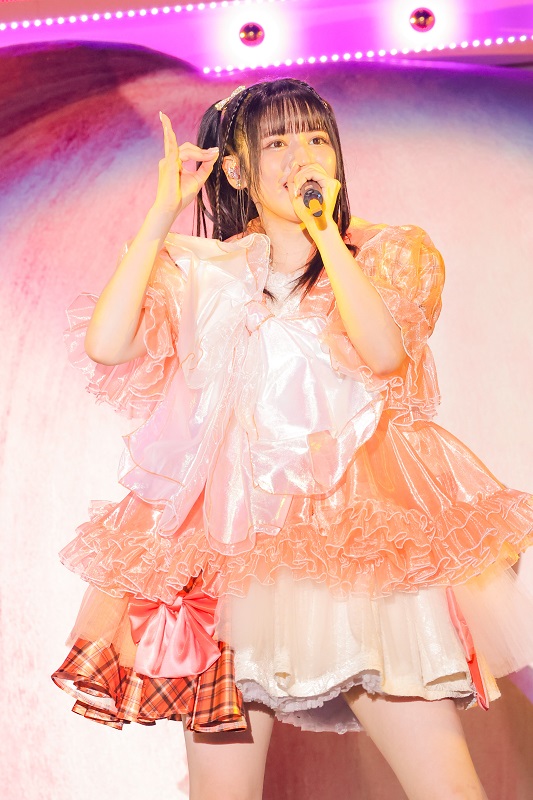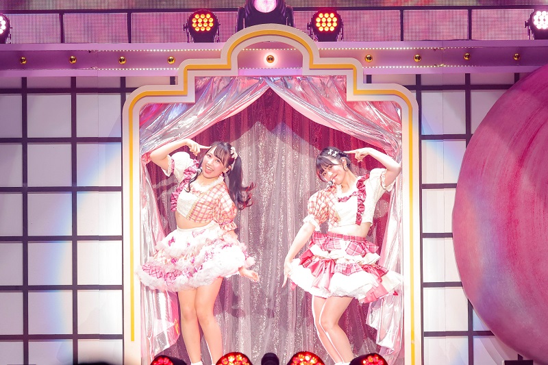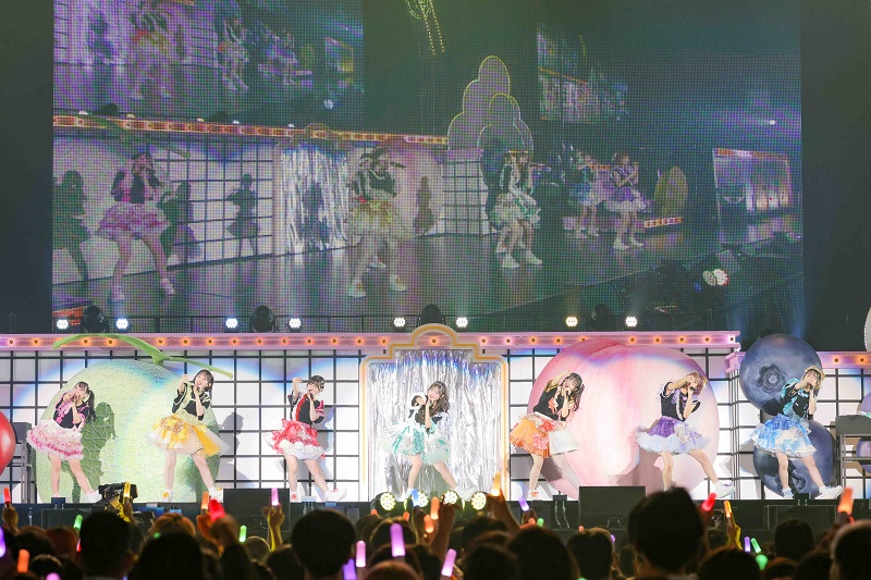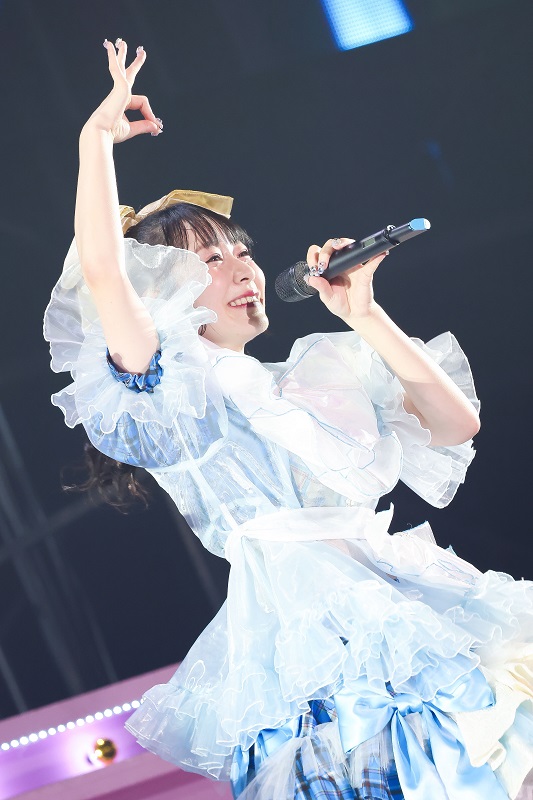 大盛り上がりだったユニットパートの勢いそのままにライブは続く。メンバーそれぞれによって形が異なるリボンが特徴的な新衣装を着用して登場する。『世界はキミからはじまる』『うぇるかむとぅ〜ざ♡ふるっぱー』と2曲連続で披露すると、人気曲『ハピチョコ』をパフォーマンス。今年TikTokで話題を集めた「なあぜなあぜ?」の元ネタである櫻井優衣の「なあになあに?」という歌詞の台詞に心撃ち抜かれるファンが続出した。