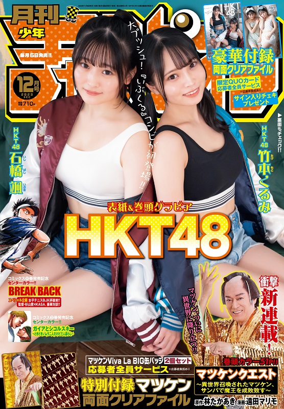 HKT48の石橋颯さん、竹本くるみさんが、6日発売の漫画誌「月刊少年チャンピオン」12月号(秋田書店)にて表紙&巻頭グラビアに登場している。