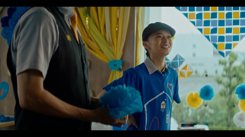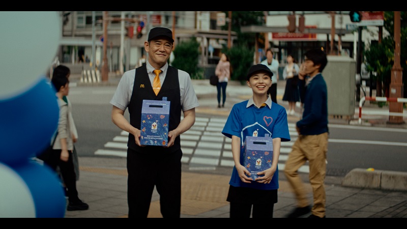 新テレビCMは、青いマックの日に向けて大きな“青い輪”となり、病気と向き合う子供たちやその家族を支援するDMHへのチャリティが広がっていく様子を描いている。マクドナルド店舗を青色に装飾しながらお客さんを迎える準備を進めていた店長役の杉本哲太さん、そしてクルーを演じる上國料萌衣さんが駅前で開催される“青いマックの日”のイベント会場に足を運ぶと、そこには特別サポーターとして“青色の姿”で駆けつけたサンリオのキャラクター・マイメロディや大勢のボランティアの人々、そしてチャリティに協力しようと足を運んでくれた多くの人々の笑顔が…。“青いマックの日”がみんなの協力によって盛り上がり支援の輪が広がっていくことを実感しながらも、さらに青いマックの日を盛り上げ広げていこうとする杉本さんと上國料さんだ。