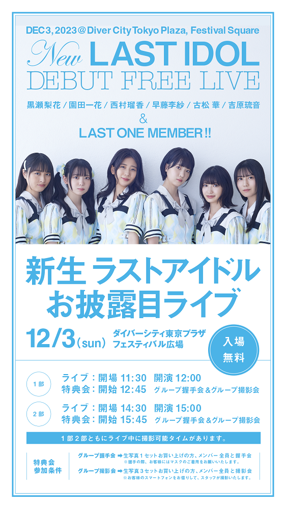 アイドルグループ・新生ラストアイドルが、12月3日(日)、ダイバーシティ東京プラザフェスティバル広場にて、お披露目ライブを開催することを発表。ライブと特典会(握手会/撮影会)を2部制で行い、新曲を含めたパフォーマンスを初披露。また「LAST ONE MEMBER AUDITION」で募集していた7人目のメンバーも発表となる。